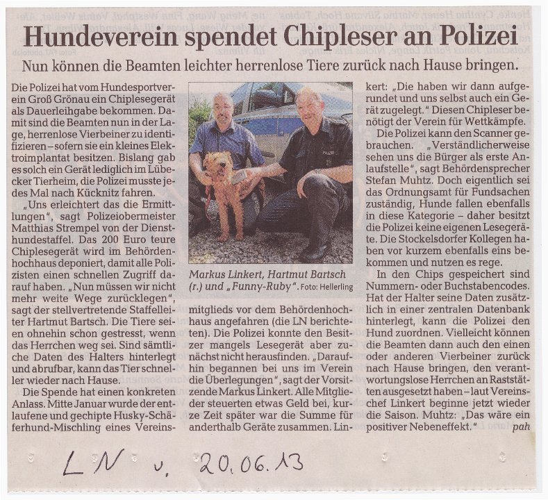 Hundeverein übergibt Chiplesegerät an Polizei - LN vom 20.06.2013
